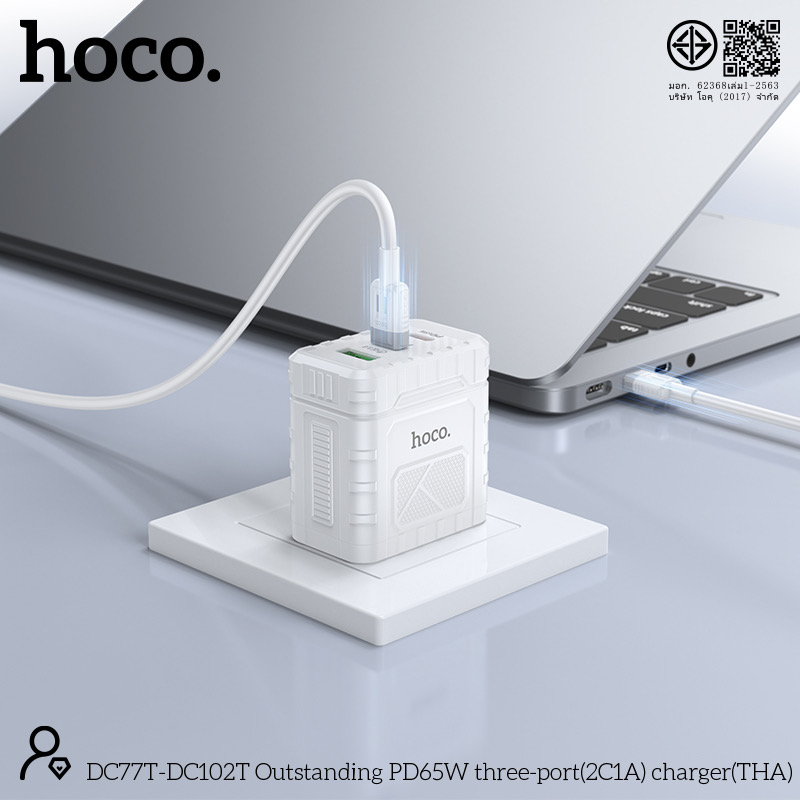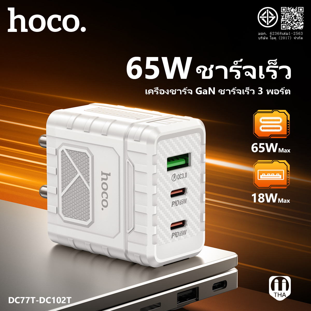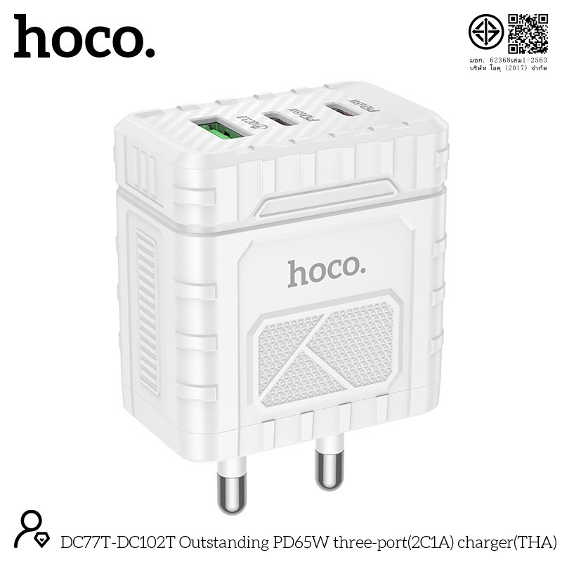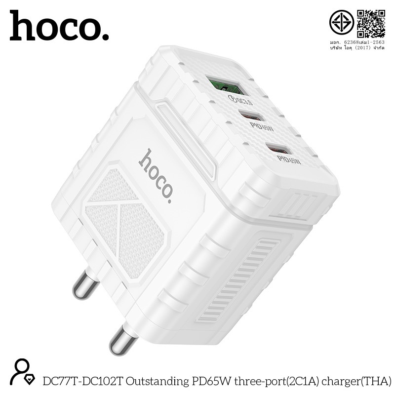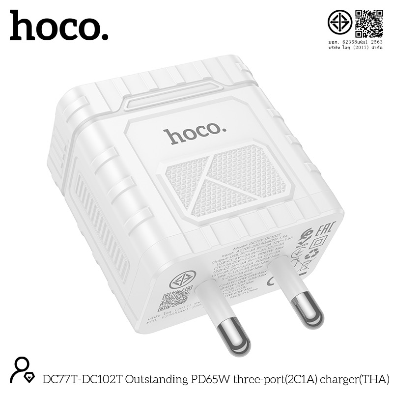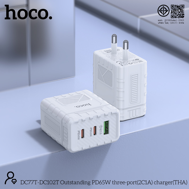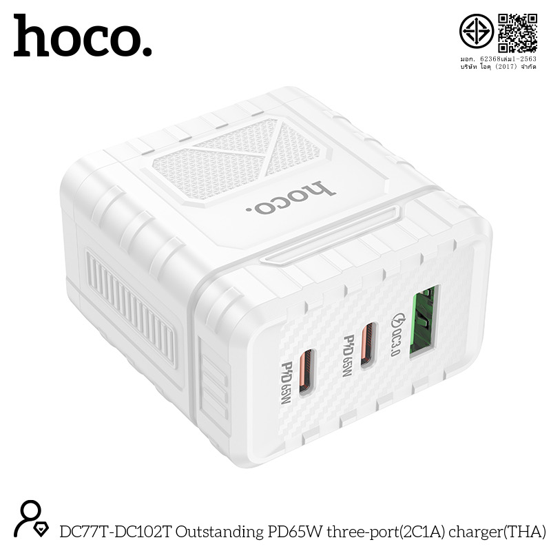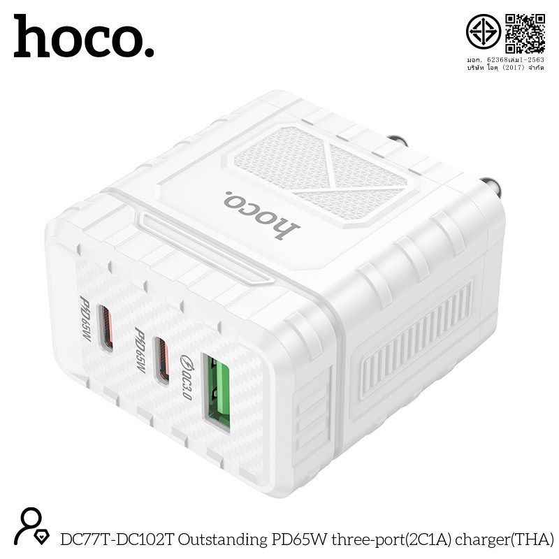 Hoco DC77T-DC102T รองรับอุปกรณ์หลายเครื่องพร้อมกัน! PD65W ชาร์จเร็วเต็มกำลัง รองรับการจ่ายไฟสูงสุด 65W ชาร์จอุปกรณ์ได้ไวขึ้น รองรับการชาร์จพร้อมกัน 3 เครื่อง มี 3 พอร์ต (USB-C1, USB-C2, USB-A) รองรับหลายระบบชาร์จเร็ว อาทิ PD, PPS, QC3.0/QC2.0, FCP/SCP, AFC และอื่น ๆ