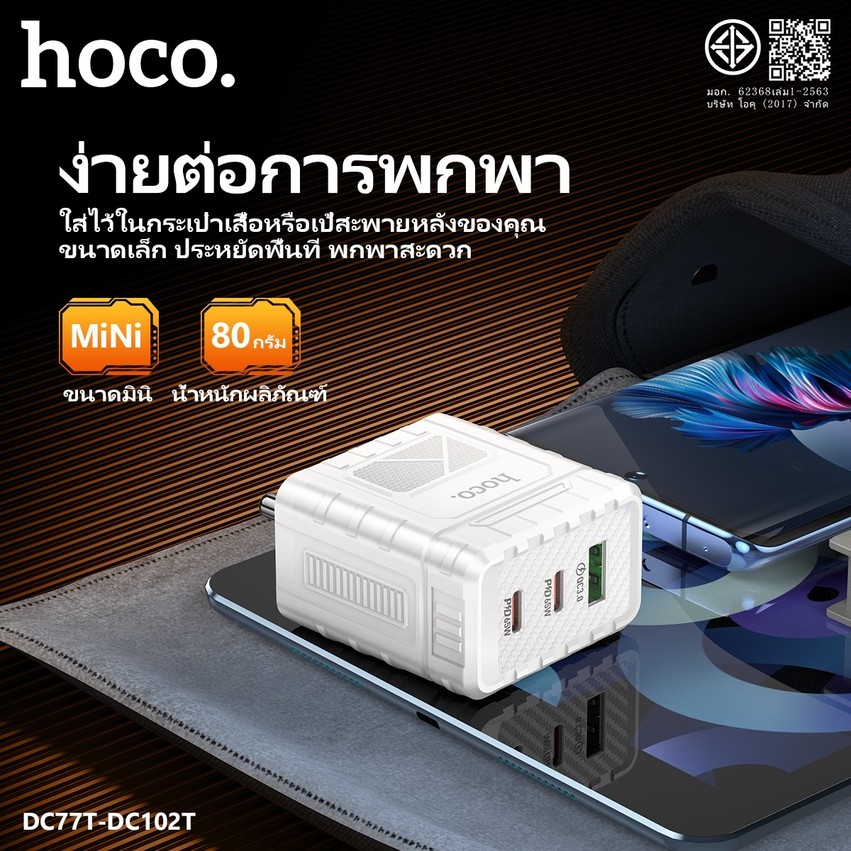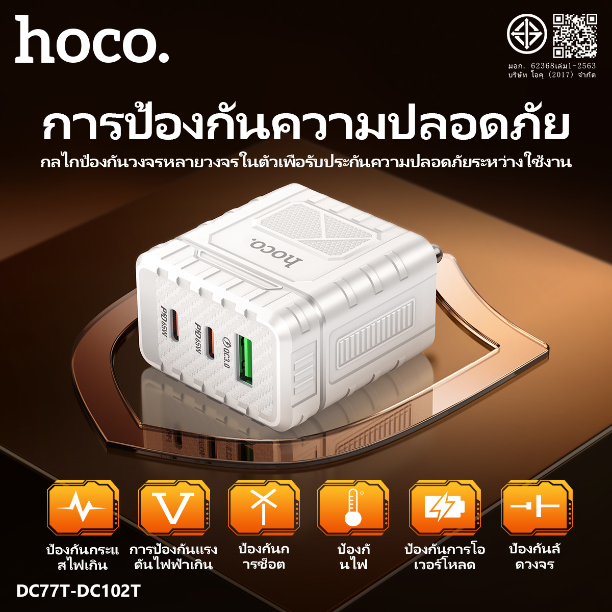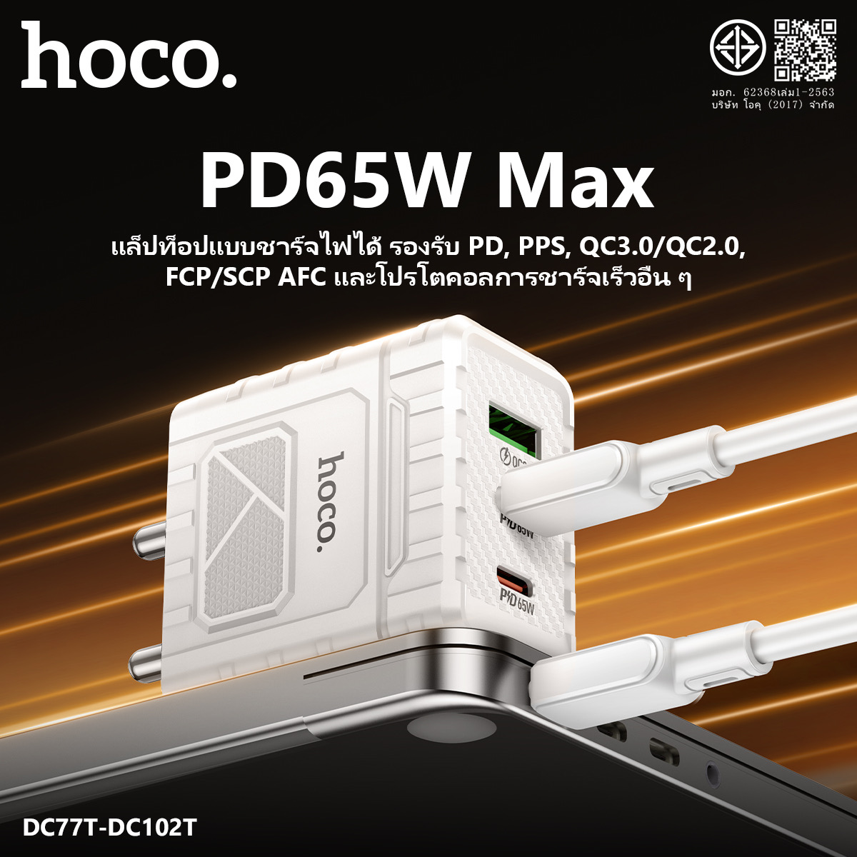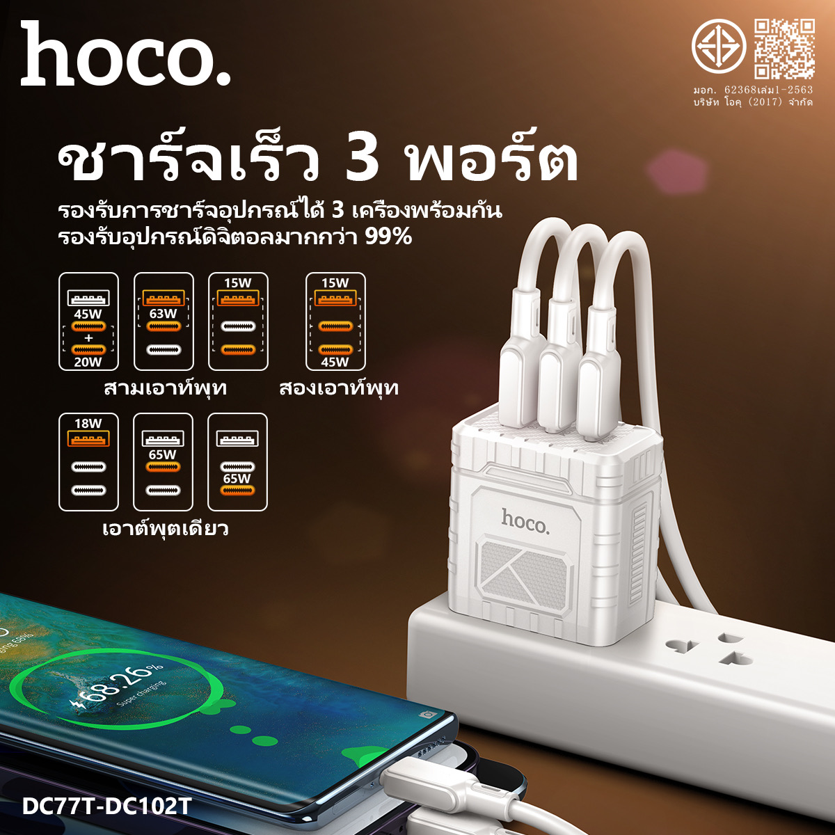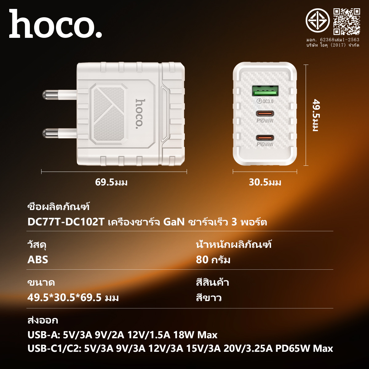 Hoco DC77T-DC102T รองรับอุปกรณ์หลายเครื่องพร้อมกัน! PD65W ชาร์จเร็วเต็มกำลัง รองรับการจ่ายไฟสูงสุด 65W ชาร์จอุปกรณ์ได้ไวขึ้น รองรับการชาร์จพร้อมกัน 3 เครื่อง มี 3 พอร์ต (USB-C1, USB-C2, USB-A) รองรับหลายระบบชาร์จเร็ว อาทิ PD, PPS, QC3.0/QC2.0, FCP/SCP, AFC และอื่น ๆ